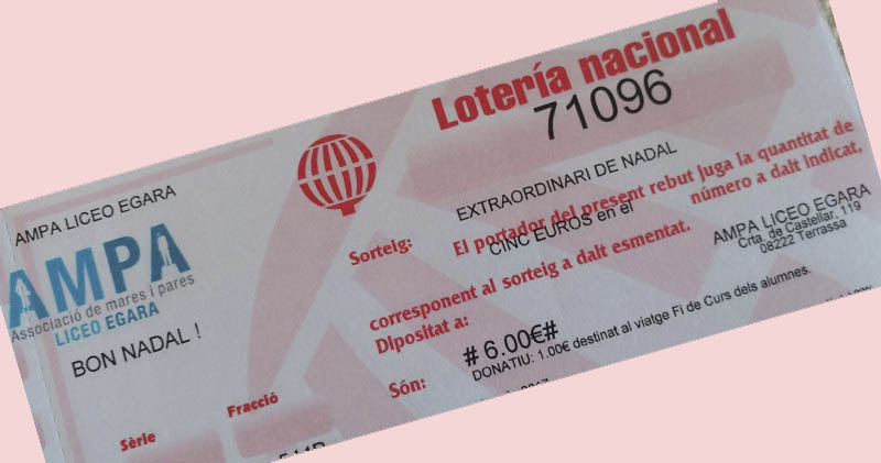 Com podeu veure a la imatge, són participacions de 6 €, on es juguen 5 € i amb l’euro restant estareu col·laborant a que els nostres nois grans puguin pagar-se part del seu viatge!